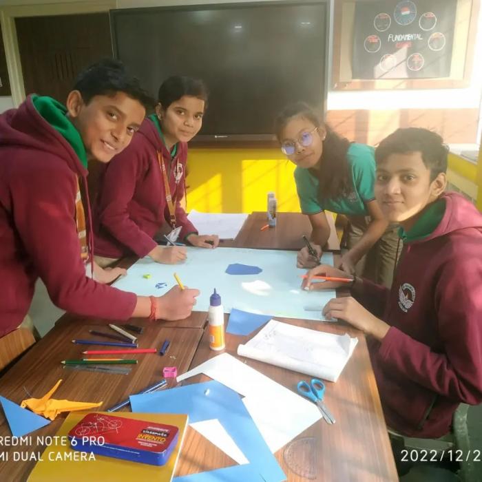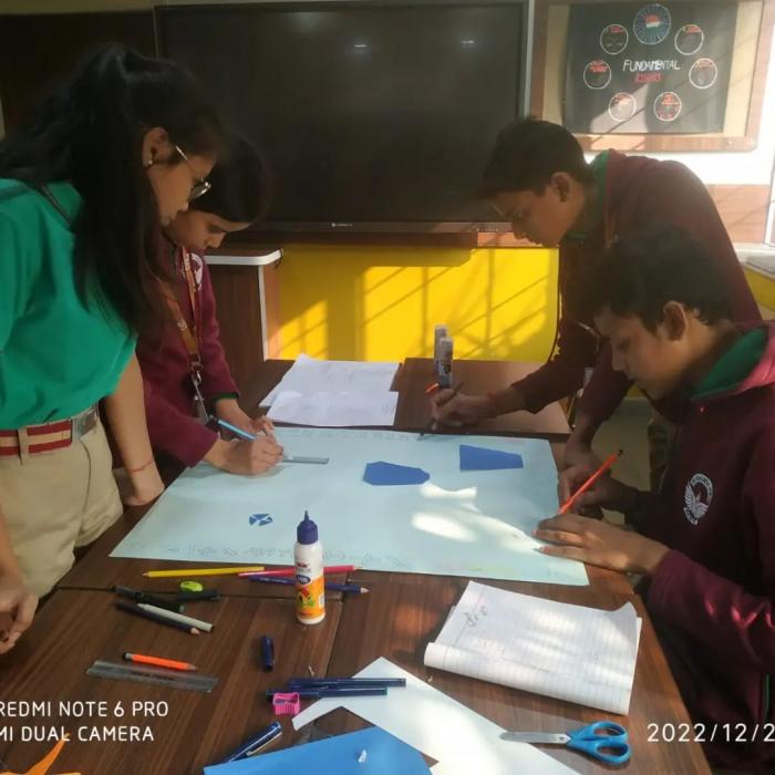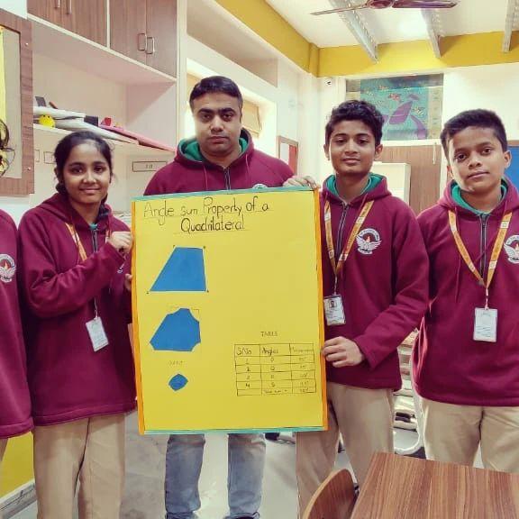 The purpose of the activity was to prove that the sum of the angles of a quadrilateral is 360°. The students of class 8 were divided into two groups to perform this activity. Using mathematical resources, they created quadrilaterals, removed their angles, and joined the cut-outs to get the sum of the angles of a quadrilateral is 360°.